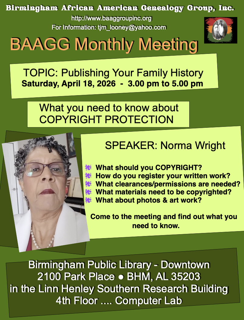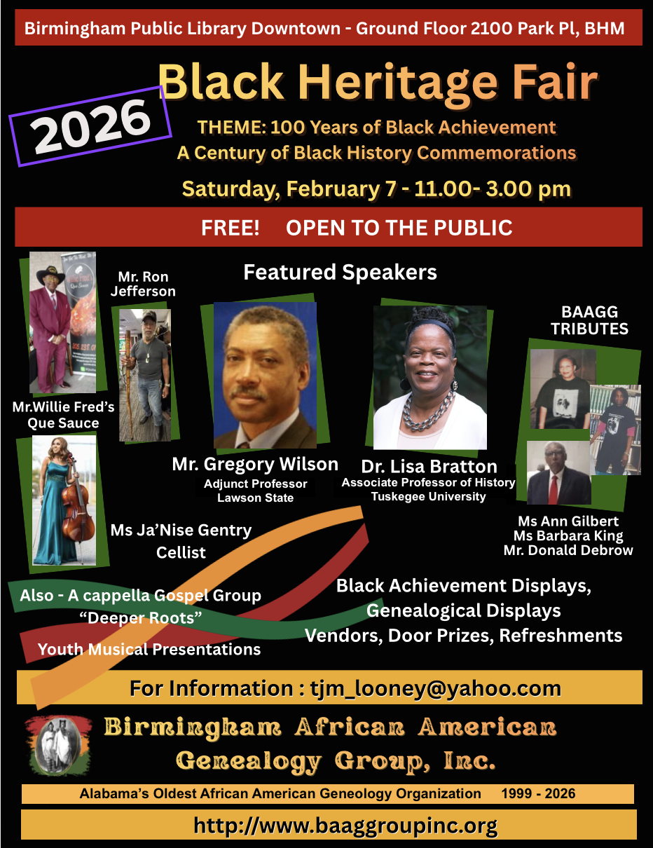 In 2013, the group became incorporated in the state of Alabama and the name was changed to the Birmingham African American Genealogy Group, Inc. We are a 501(c)3 tax exempt organization. Our tax identification number is EIN 86-1099545.