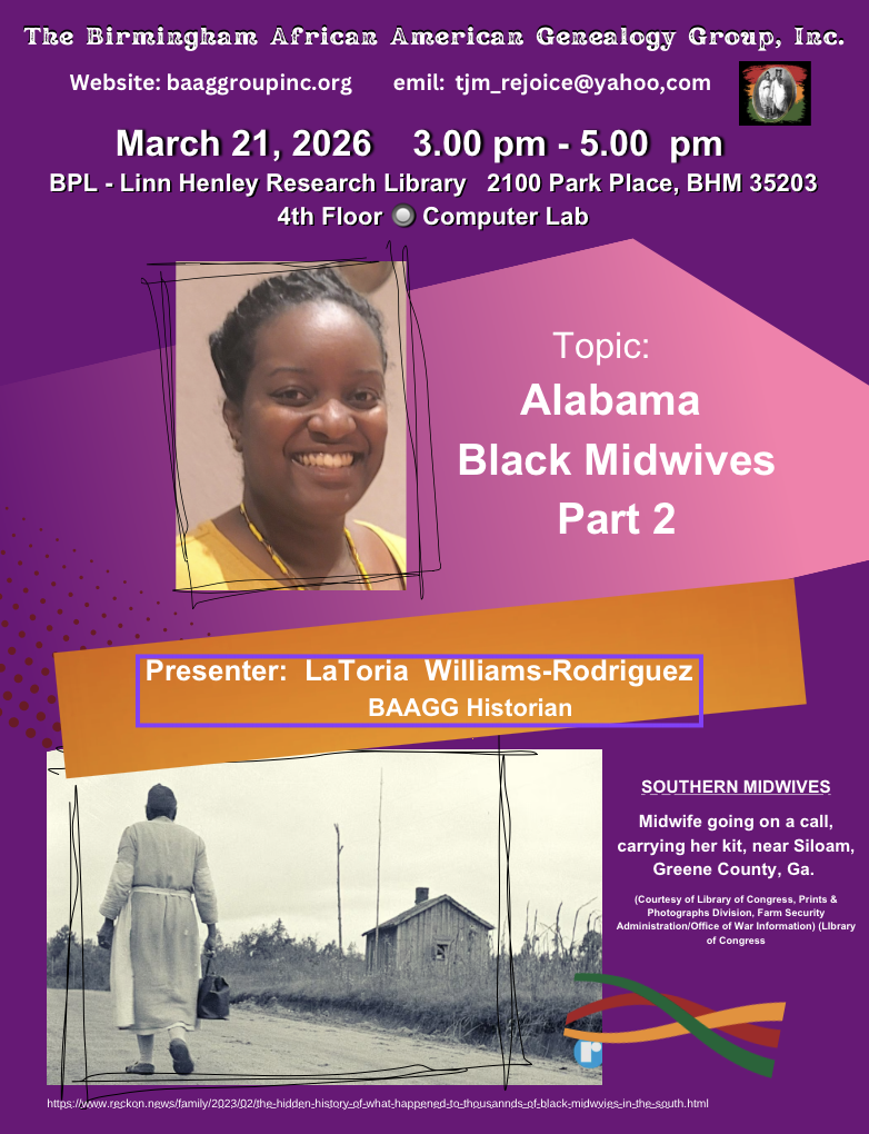The Birmingham African American Genealogy Group, Inc. is the oldest African American genealogy group in the state of Alabama. Its purpose is to encourage genealogical and family research among individuals and the community with the objective of seeing African Americans become aware of their history and heritage.